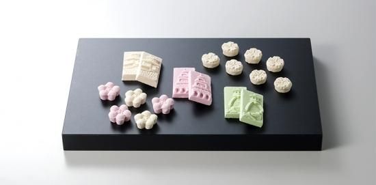 和三盆糖菓子で金沢の名勝尾山神社と兼六園に降る雪を表現した「尾山の雪」。