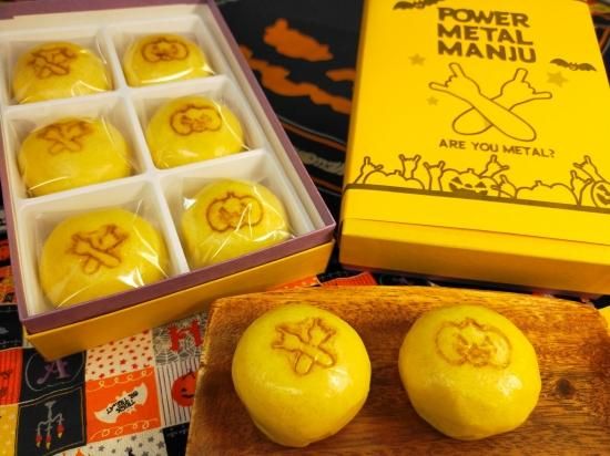 ヘヴィメタルを愛する板屋4代目が独断で作った和菓子界史上初(?)のメタルをテーマにした万頭。板屋自慢のカボチャ餡を包んだ万頭に、カボチャとメロイックサインの焼き印が押されたパワーメタル感溢れる一品です。メタルファンの方もそうでない方も、お茶菓子に手土産にメタル鑑賞のお供に是非どうぞ。STAY METAL!!